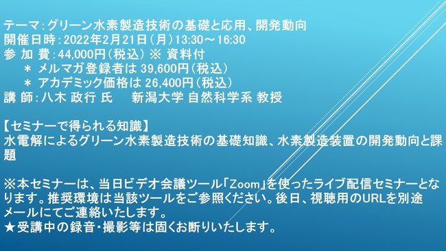 先端技術情報や市場情報を提供している(株)シーエムシー・リサーチ(千代田区神田錦町: https://cmcre.com/ )では、 各種材料・化学品などの市場動向・技術動向のセミナーや書籍発行を行っておりますが、 このたび「グリーン水素製造技術の基礎と応用、開発動向」と題するセミナーを、 講師に八木 政行 氏 新潟大学 自然科学系 教授)をお迎えし、2022年2月21日(月)13:30より、 ZOOMを利用したライブ配信で開催いたします。 受講料は、 一般:44,000円(税込)、 弊社メルマガ会員:39,600円(税込)、 アカデミック価格は26,400円(税込)となっております(資料付)。