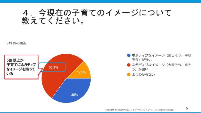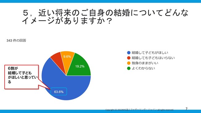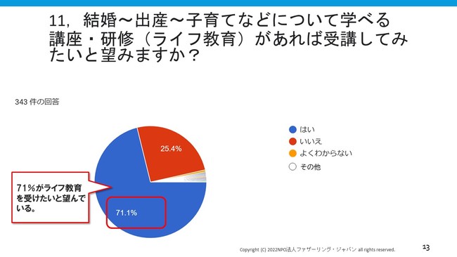 NPO法人ファザーリング・ジャパン(東京都千代田区 代表理事:安藤哲也)は、令和時代の学生達の結婚や子育てに対する考えを知るため、首都圏の大学生を中心とした学生343人に対し、「学生向け『現代の子育て講義』ニーズ調査」を行いました。その結果、「育児にネガティブなイメージ(大変そう、辛そう)が強い」と回答した学生が52.8%と過半数を超え、「結婚して子どもがほしい」と回答した学生が6割近く(63.6%)いることがわかりました。さらに、「結婚、出産、子育てなどについて教わることができる講座や研修があれば受けてみたい」と回答した学生が7割超(71.1%)にのぼり、職業上のキャリア教育だけでなく、いわゆる「ライフキャリア教育」に対する学生のニーズ・関心の高さが浮き彫りとなりました。