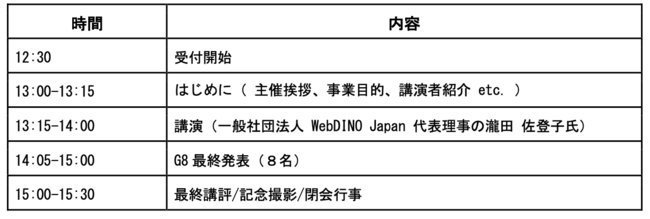 G8メンバーとして選ばれた彼女たちは、11月以降、県内外で活躍する女性起業家による講演やワークショップ、プレゼンスキルアップセミナー等特別プログラムを受講し、女性として社会で活躍するために必要なスキルやマインドセットを身につけてきました。