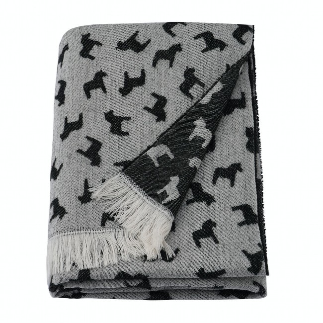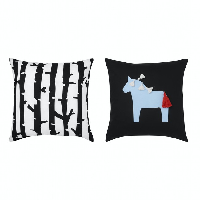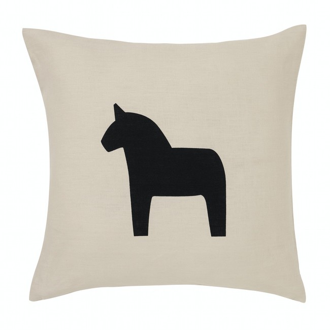 ダーラナホースのたてがみとしっぽの部分にタッセルをあしらった遊び心満載なデザインのクッションカバー。裏面は、白と黒で白樺をイメージしたデザインになっています。表と裏で異なるデザインなので、簡単に雰囲気を変えられます。