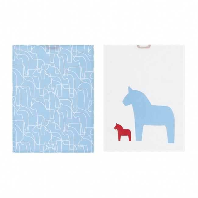 ダーラナホースのシルエットをおしゃれな模様にしたのが、キッチンクロス2枚セット。キッチンにモダンな見た目をプラスします。持続可能な方法で栽培した綿100%使用しています。洗うたびに柔らかさが増す、耐久性に優れた天然素材です。