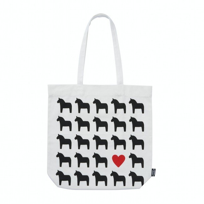 持ち手と内ポケットを備えた、ゆったりとした布製バッグにダーラナホースのシルエットをあしらいました。真っ赤なハートがデザインにインパクトを与えます。