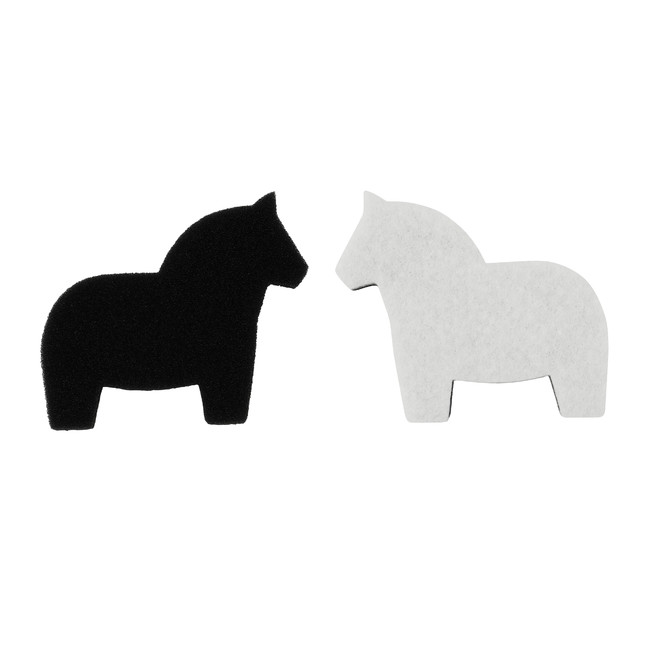 ダーラナホースのシルエットをかたどった、目の詰まったブラック/ホワイトのスポンジ。表と裏でスポンジの種類が異なります。スポンジの柔らかい面は軽い汚れを落として水分をさっと拭き取るときに、目の粗い面はがんこな汚れを落とすのに適しています。
