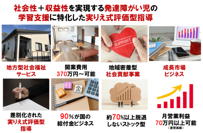 しかし、シンプルといっても専門性が高く、また自社開発の指導法も組み込まれているため奥深く高度な技術が必要とされますが、それらを誰もが実施でき成果が出る高い質の維持ができるよう全てをパッケージ化しました。放課後等デイサービスを求める顧客は年々増加傾向にあるため、この実現により、「専門性の高いサービス」を、「パッケージ化された質の高い指導技術」で、成果を出し「顧客をファン化」できる実りえこそが、唯一無二の差別化された業態であり継続的に存続可能な安定事業であると考えます。