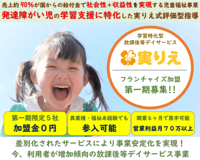 新しい事業の柱を立てたい。新規事業を探している。社会貢献事業で独立開業を考えている。放課後等デイサービスのフランチャイズ加盟を考えている。発達障がい児支援デイサービスのフランチャイズ加盟を考えている皆様からの応募をお待ちしております。地域に限りなく、全国に拡大を図ってまいります。
