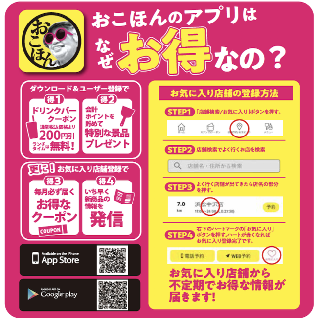 アプリ限定クーポンや、貯めた来店スタンプで限定グッズがゲットできる、お得なアプリです。季節ごとに変わる期間限定メニューのご紹介や、現在地の近くにある店舗の検索や予約をしていただけます。