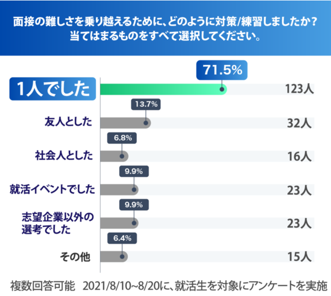 しかし、株式会社Synergy Careerが就活生にアンケートを実施したところ、就活生の約70%がただ一人で回答を作成するだけで、実践的な面接練習を出来ていない現状がありました。
