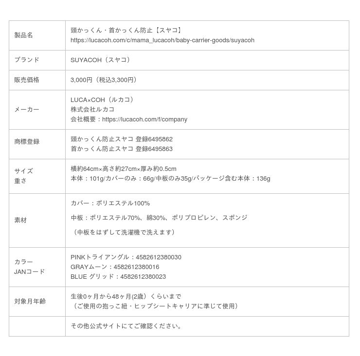 育児用品を製造販売する、株式会社ルカコ(代表取締役:仙田 忍、本社:大阪府豊中市=以下 ルカコ)は抱っこ紐の「だらーん」を解決する抱っこ紐収納カバー【ルカコ】(8万個以上販売)の第2弾【スヤコ】は抱っこ紐の「頭かっくん」を解決するべく誕生。抱っこ紐マニア、ユーザー現役・先輩ママ、保健師・看護師、デザイナー、モノづくりメーカー、デザイナーが開発に携わり誕生しました。2022年2月2日ルカコ通販サイトで新発売!今後全国のベビー用品売場などに展開予定。