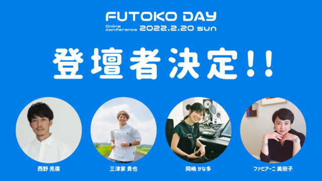 株式会社クラスジャパン学園(所在地: 東京都渋谷区、代表取締役中島 武)は、『もう一つの成長の機会』があることを共有していくことを目的に、日本初の不登校のための大規模カンファレンス「FUTOKO DAY 2022 」を、2022年2月20日(日)13時からオンラインで開催致します。この度、西野亮廣さん、プロランニングコーチ/三津家貴也さん、作詞作曲家/岡嶋かな多さん、アートディーラー/ファビアーニ美樹子さんの登壇が決定致しました。また登壇者のシンガーソングライター Annaさん、KZ from 梅田サイファーさんからもコメントをいただきましたので、併せてお知らせ致します。