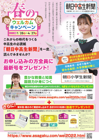 朝日学生新聞社は、1月28日(金)~4月27日(水)まで朝日小学生新聞、朝日中高生新聞「春のウエルカムキャンペーン」を実施中です。国語や算数、理科、社会など、すべての教科の基礎となる「読解力」や「思考力」アップを全力で応援します。