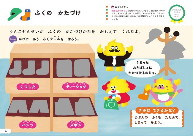 「シールでできるかな?」では、それぞれ日常生活を送るうえで大切にしたい挨拶・片づけ・身だしなみのシーンを扱っています。シールを貼って楽しく疑似的に学ぶことで、お子さまの実際の場面で役立てることができます。