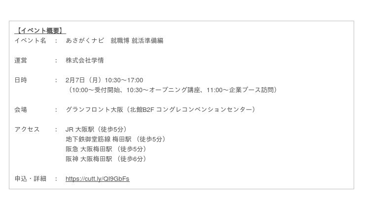 国内最大級の貸会議室検索サイト「会議室.COM」を運営するアスノシステム株式会社(東京都港区/代表取締役社長 齋藤 武育/ 以下、「アスノシステム」)は、 2022年2月7日(月)、8(火)にグランフロント大阪にて開催される、株式会社学情が主催する就活準備イベント『あさがくナビ 就職博 就活準備編 』に参加いたします。