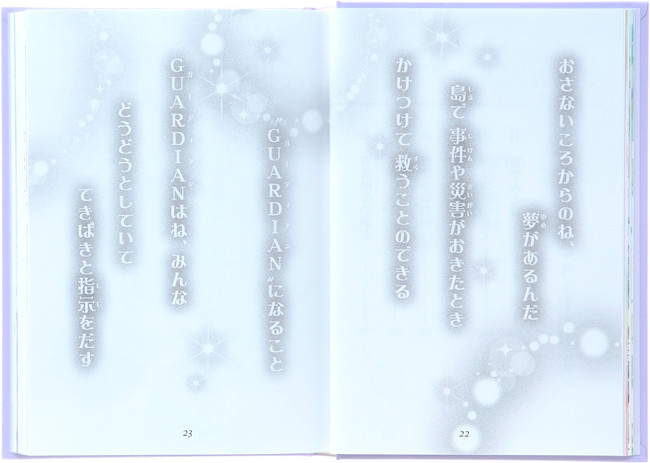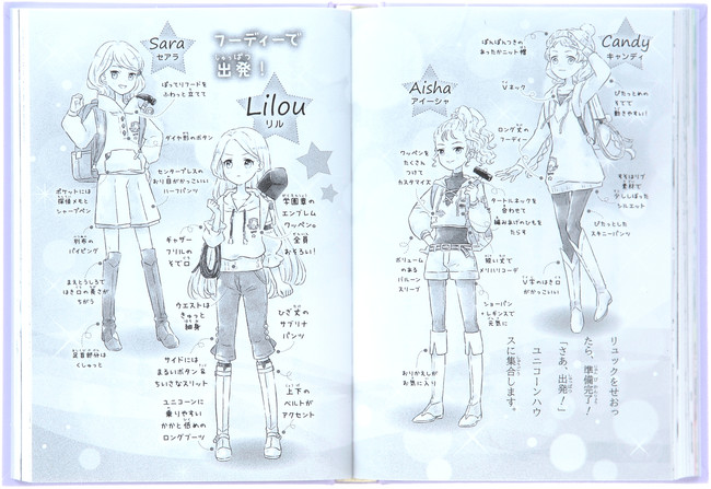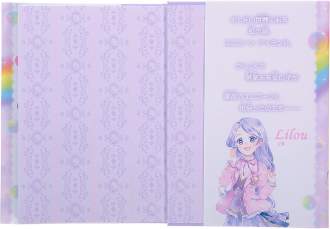 原作の中ページは文字中心でイラストも少なめ…という構成でしたが、「虹の島」では、物語のおもしろさ以外に、1.表紙をめくるとキュートな模様の見返しが登場、2.巻頭には16Pにわたるカラーページ、3.巻末の封筒には主人公からのお手紙とインスタント写真風カード、4.物語の始まりと終わりに主人公の心情を伝えるポエムのページ、5.物語の途中に登場人物のファッション解説ページ、6.巻末におまけの学園新聞のページ …など、女子小学生が次々にページをめくって読み進めたくなる「お楽しみ」要素を、ふんだんに追加しました。