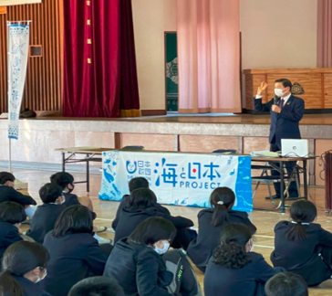日本財団「海と日本プロジェクト」の概要や日本・鹿児島の海の現状、海と食の地域モデルinかごしま実行委員会の取り組みについて説明しました。