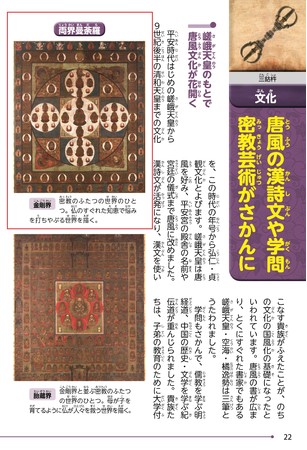 8世紀と9世紀の遣唐使の派遣と文化についての説明を選ぶ問題。「密教の世界を構図化した両界曼荼羅」は日本の歴史4巻の資料ページにカラーで掲載。