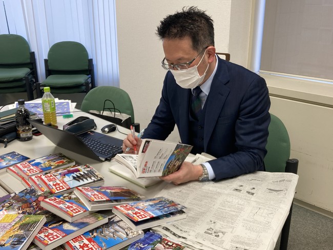 共通テスト6日後の1月21日(金)、新聞の解答速報を見ながら「日本の歴史」全20巻を丹念に探す伊藤賀一先生。