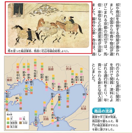 室町時代の運送業者について述べた文章XとYの正誤の組み合わせを選ぶ問題。馬借を描いた「石山寺縁起絵巻」は「日本の歴史」9巻の巻頭の資料ページに近江国周辺の地図とともに紹介されています。まんがの中には「近江坂本で馬借が徳政を求め暴れております!」とセリフの中に、正解がバッチリ入るようなシーンも。