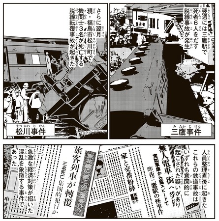 1945年~55年に撮影された写真の説明として正しいものを選べ、という問題。資料として掲載された福島県松川駅付近の写真は日本の歴史19巻P104でほぼ同じものがイラスト化されて掲載。まんがの中の「急激な経済対策が招いた混乱を象徴する事件」として描かれた「松川事件」を覚えていれば解答可能な問題でした。