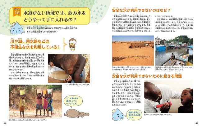 また、世界では今でも安全な水、清潔なトイレがない地域も数多くあります。SDGsの目標6は「安全な水とトイレを世界中に」です。世界の水と下水の現状と問題、その解決に向けた取り組みも紹介しています。