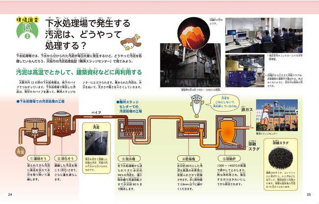 台所や洗面所、トイレなどで使われたあとの水は下水道を通じて下水処理場へと流れていきます。下水処理場では沈殿、濾過、微生物による分解が行われ、水をきれいにしていきます。その仕組みを豊富な写真やイラストで分かりやすく解説しています。また、公園や大規模施設での雨水の再利用、企業による水質浄化の実例も紹介。また、下水道が整備されていない地域での浄化槽のはたらき、バキュームカーによるし尿処理などもあわせて掲載しています。