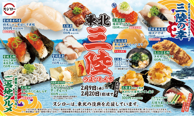 スシローの『東北三陸うまいもん市』では、東北・三陸産の海の幸を一部使用する事で、東北の復興を応援しています。