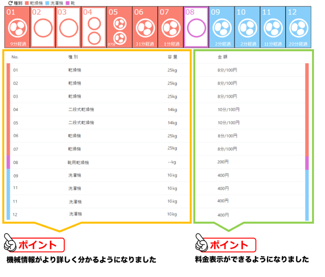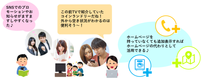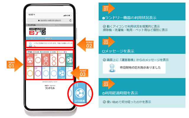 「ランドミル」は、既存の設備にアイテムを加えるだけでリーズナブルに、ランドリー機器の利用状況を「見える化」するIoTソリューションです。機器の入れ替えが無いため、店舗運営を止めることなく1日で工事が完了します。ご利用者様が来店前に、「わかるといいな」と思う機器の利用状況や経過時間を確認できるため、お店選びに迷っている顧客やリピーター獲得のためのプロモーションツールとしての活用も期待できます。当製品は導入時に補助金を活用した実績があるのも強みです!