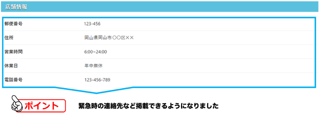 住所・営業時間・定休日・電話番号などお客様が知りたい情報を表示できます。