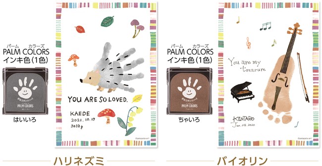 2019年3月に発売した手形・足形アート制作キット「ファーストアート」は、手形スタンプパッド「パームカラーズ」と作品用台紙、飾り付けシール、飾り付け専用ペン、木製フレームがセットになった制作キットです。肌に優しく簡単に洗い落とすことができるインキが特長の「パームカラーズ」を使い、手形・足形を押してペンやシールなどで装飾することで、世界に一つだけのアート作品を簡単に作ることができます。手形アート作品は、お子さまの成長記録として楽しむことはもちろん、おじいちゃんおばあちゃんへのプレゼントにも最適です。