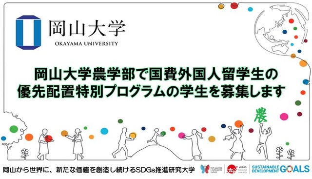 国立大学法人岡山大学(本部:岡山市北区、学長:槇野博史)の農学部は、「食料の量的質的需要が拡大するアジア・アフリカ地域の食料供給を支え、環境を保全しつつSDGsを実現できる幅広い知識・見識と国際的な対応能力を持った人材」の養成を目的として、国際農学プログラム(GAP)の外国人留学生を募集します。