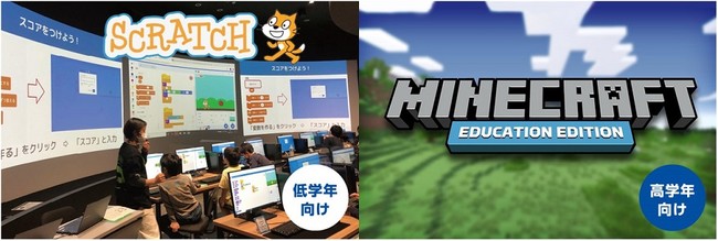 ◆小学校低学年には「SCRATCH(スクラッチ)」、小学校高学年には「MINECRAFT(マインクラフト)」と人気のプログラミングを体験。