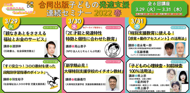 合同出版では連続セミナー「合同出版 子どもの発達支援 連続セミナー 2022春」を2022年3月29日(火)~3月31日(木)に全6回講座で開催いたします。