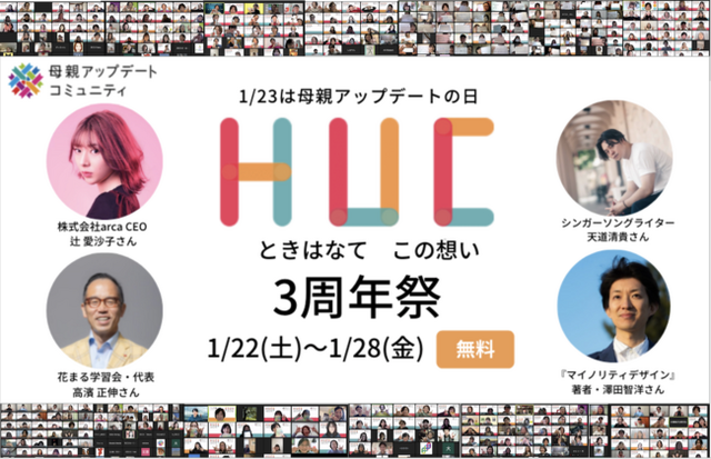 一般社団法人母親アップデートは、運営する母親アップデートコミュニティ(HUC)の設立3周年を記念するイベント「HUC3周年祭 ときはなて、この想い~想いのタネを見つけよう~」を2022年1月22日(土)~28日(金)に完全オンラインで開催しました。全24のコンテンツに累計2533人の申し込みがあり、花まる学習会・代表の高濱正伸さん、株式会社arca CEOの辻愛沙子さん、『マイノリティデザイン』著者の澤田智洋さん、シンガーソングライターの天道清貴さんをはじめ多彩なゲストにご登壇いただきました。メンバーが自発的に企画し、全24のコンテンツを共創した要因が、今あらゆる組織やコミュニティに求められる「心理的安全性」です。