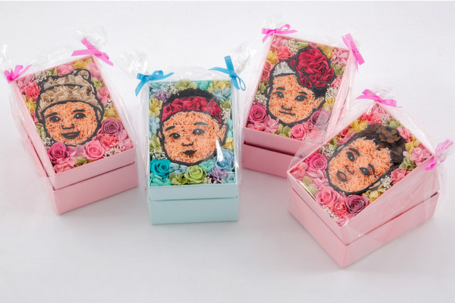 お気に入りのお孫さんの写真を送るだけで、専属のイラストレーターが似顔絵イラストを制作。水やり不要で枯れないお花・プリザーブドフラワーを一輪ずつアレンジしてフラワーアートに仕上げます。