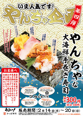 コロワイドグループのかっぱ寿司(カッパ・クリエイト(株) 本社:神奈川県横浜市)は、2022年2月14日(月)~2月20日(日)の期間限定で、かっぱ寿司全店にて「本気寿司シリーズ」“やんちゃ企画”第4弾『やんちゃな大海鮮手巻き寿司』を販売いたします。