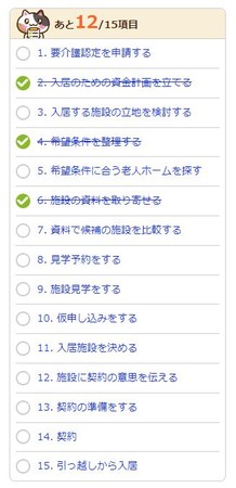 老人ホームを探すときの「やることリスト」のうち、準備が完了したものから打消し線で「ー」マークを付けることが可能です。このページをブックマークしていただけますと、一度ページを閉じて再度開いた時にも再度確認することが可能です。