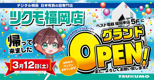 株式会社ヤマダデンキ(本社:群馬県高崎市、代表取締役社長:小林辰夫)は、パソコンおよびパソコン周辺機器を販売するTSUKUMO(ツクモ)ブランドにおいて、ツクモ博多店を現在の店舗から移転、福岡県福岡市天神のベスト電器福岡本店内にパソコン専門店「ツクモ福岡店」として名称を変更し移転オープンするとともに、2022年3月12日(土)より記念特価セールを開催いたします。
