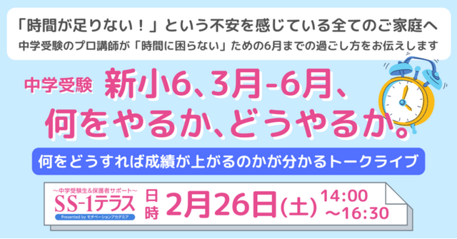 株式会社リンクアンドモチベーション(本社:東京都中央区、代表:小笹芳央、証券コード:2170)のグループ会社で、学習塾「中学受験専門個別指導教室 SS-1」(https://www.ss-1.net/)を運営する株式会社モチベーションアカデミア(本社:東京都中央区、代表:柿木秀雄)は、2022年2月26日(土)に中学受験を目指すお子さんを持つ保護者様向けトークライブ「新小6、3月-6月、何をやるか、どうやるか。」を開催いたします。