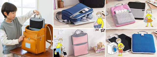 オンライン学習などにより、ノートパソコンやタブレットを学校や塾とご家庭の間で持ち運ぶ機会が増えています。タブレットなどを安心して持ち運べるように衝撃に強いモデルや小物収納ポケット付きのモデル、さらには丸洗い可能なクッションメッシュ素材を採用したモデルなど4種類のバッグをご用意しました。どのバッグも手に優しいソフトハンドルを採用しており、紛失防止にも役立つネームタグを装備しています。