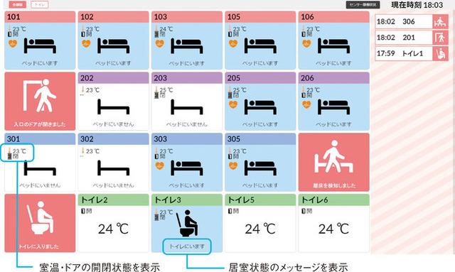 ライブコネクトは、多種多様なセンサーを介護施設内に設置し、介護施設全体を可視化します。