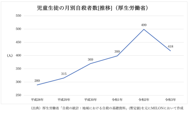 長期に渡るコロナ禍においては、子どもたちへのメンタル面での影響が危惧されており、積極的な心のケアをしていくことが社会的な課題になりつつあります。厚生労働省の調査によると令和3年(2021年)における児童生徒の自殺者数は418人で、過去最多となった令和2年(2020年)からは減少したものの、過去2番目に高い数字となっています。