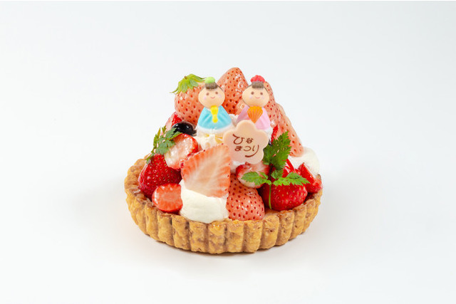 フレッシュないちごから作った自家製いちごピューレを生クリームに練りこんだ、くちどけが良くいちごの香りと甘酸っぱさが心地よい、フルーツピークスこだわりのいちごクリームを使用しています。可愛らしいお雛様のオーナメントと、フリル状にトッピングしたいちごクリームの見た目がマッチした、ひな祭りのお祝いにおすすめのタルトです。