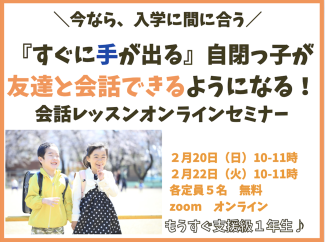 この度は、すぐに手が出る自閉っ子が友達と会話できるようになる会話レッスンオンラインセミナーを開催致します。
