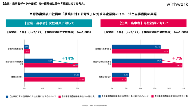 「頻回でなければ残業できる」の選択率は、企業→女性社員間で2倍弱、企業→男性社員間で+7%の乖離がある