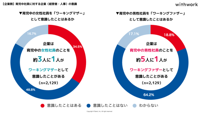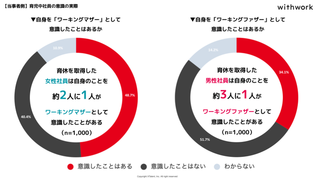 育児・介護休業法の改正により、令和4年4月1日から「雇用環境整備、個別の周知・意向確認の措置の義務化」「有期雇用労働者の育児・介護休業取得要件の緩和」が施行されます。XTalent株式会社(本社:東京都港区 代表取締役:上原達也)が運営する、ワーキングペアレンツのための転職サービス『withwork(ウィズワーク)』では、改正育児・介護休業法の施行を目前に育休取得者と企業の現況を把握することを目的に、育休取得経験のある男女2,000名と経営者・人事2,129名を対象に意識調査を実施。育休取得者と企業間の意識の実態、認識ギャップ等が調査を通して明らかになりました。