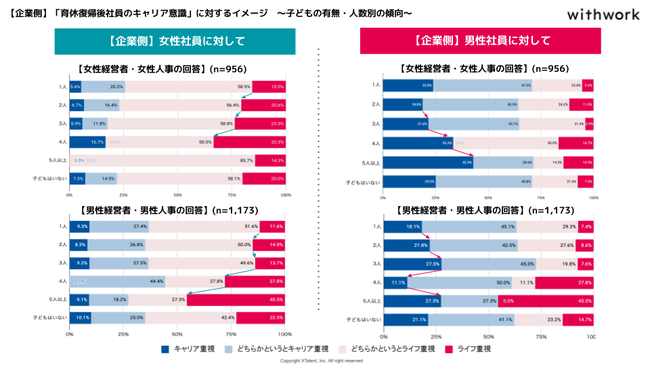 ◆ 経営者・人事自身の「子どもの人数」が多いほど、育休復帰後の社員に対して「女性はライフ重視、男性はキャリア重視」との見方が強まる。また、そのバイアスは特に女性経営者・女性人事側で顕著