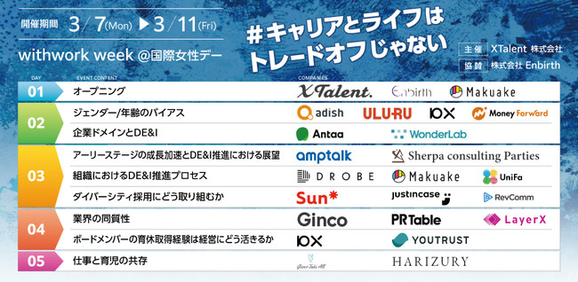 3月8日の国際女性デーに向けて、性別にかかわらず、キャリアとライフをトレードオフにしない働き方を目指すワーキングペアレンツのための転職サービス「withwork」を展開するXTalent株式会社と、働き手個人に寄り添い”本質的な”組織課題を可視化するWork Techサービス「WorkEx-働き方の健康診断」を展開する株式会社Enbirthが連携し、ワーキングペアレンツをはじめとしたあらゆる人が活躍できる組織づくり、企業のDE&I推進を目的とした取り組みを2社で共同企画・運営いたします。