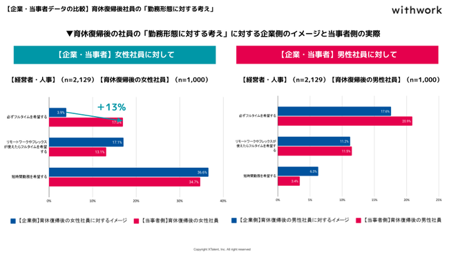 「育休復帰後、必ずフルタイムを希望する」という育休復帰後社員の比率は、企業→女性社員間で4倍超の乖離があり、企業と当事者間の認識ギャップが大きい