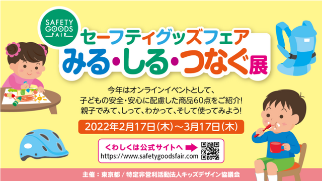 東京都、特定非営利活動法人キッズデザイン協議会は、安全・安心に配慮した商品をより多くの方へ、よりわかりやすくご理解いただくことを目的に、『セーフティグッズフェア/みる・しる・つなぐ展』を2022年2月17日(木)から同年3月17日(木)までの1か月間、オンライン( https://www.safetygoodsfair.com )で開催いたします。