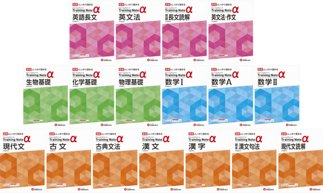 ●分野別17点を用意。英語「英語長文/英文法/英語長文読解/英文法・作文」、国語「現代文/古文/古典文法/漢文/漢字/基本漢文句法/現代文読解」、数学「数学I/数学A/数学II」、理科「生物基礎/化学基礎/物理基礎」