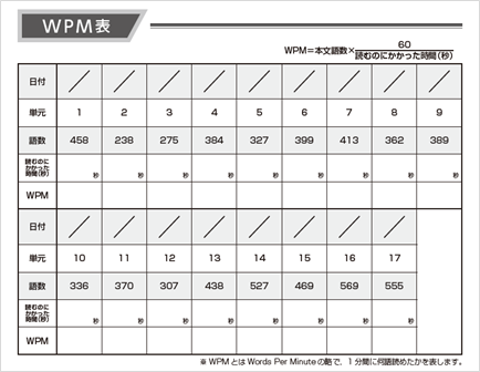 英語長文、英語長文読解ともに、読むスピードを意識できるように、目標時間と語数を表示し、WPM記入欄を設けました。またグラフや表の入った問題や記述問題を取り入れるようにしています。